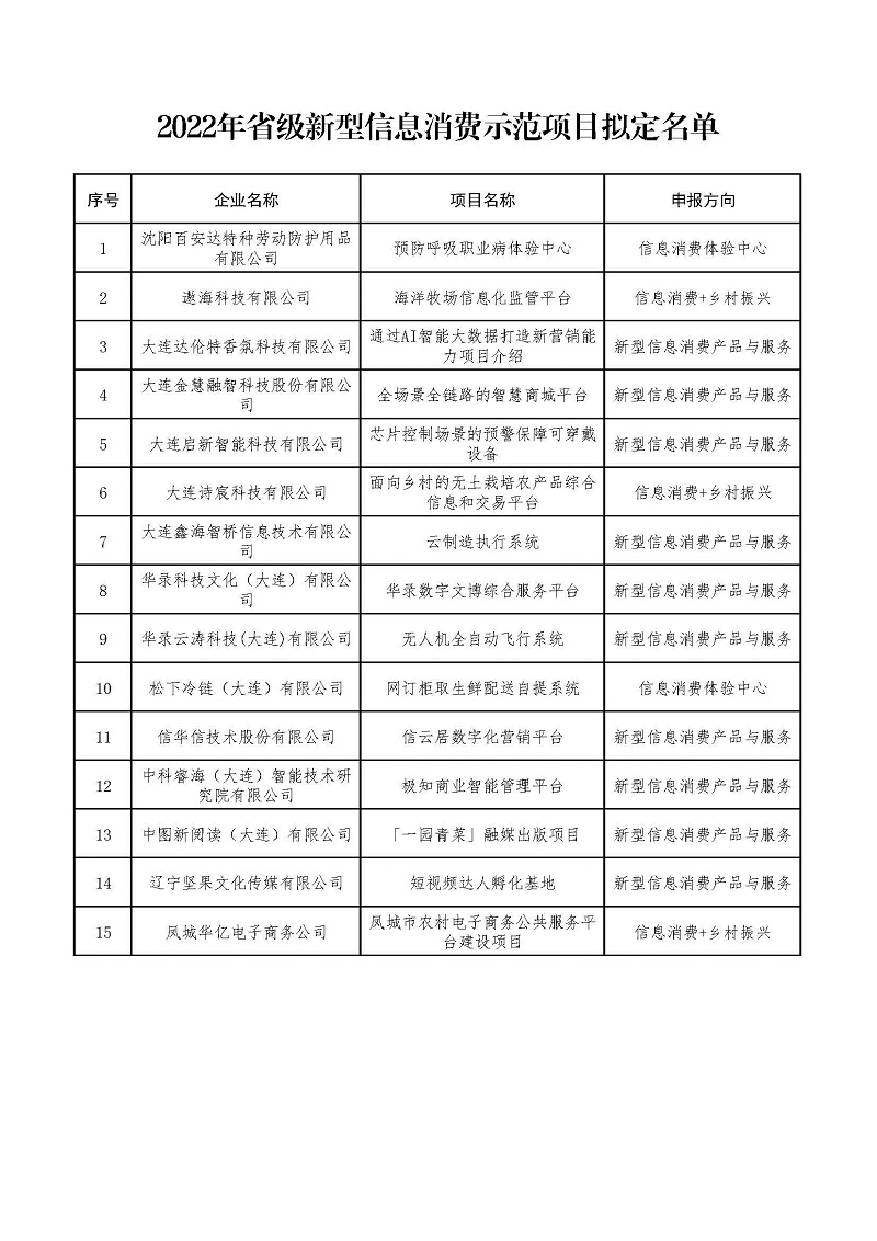 根据《关于组织开展2022年省级新型信息消费示范项目申报工作的通知》(辽工信明电〔2022〕74号)要求,经企业申报、各市推荐、专家评审,拟定15个省级新型信息消费示范项目。现将名单予以公示,公示期为2023年1月4日至1月10日。如有异议,请在公示期内说明情况并与省工信厅联系。